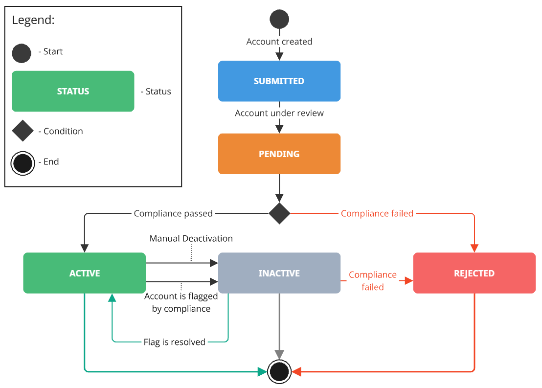 If the procedure follows the KYC path then the status of the Account will be changed to Pending and basing on the result of the KYC check the status can be then changed to "Active" in case of successful check and Rejected in case of failed check.