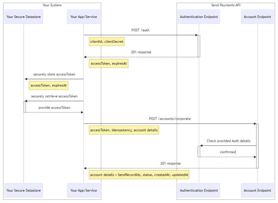 All interactions with the Send Payments API start with obtaining an Authentication Token, which is further referred to as an accessToken. You will need this to access all the Endpoints except the Authentication Endpoint itself.