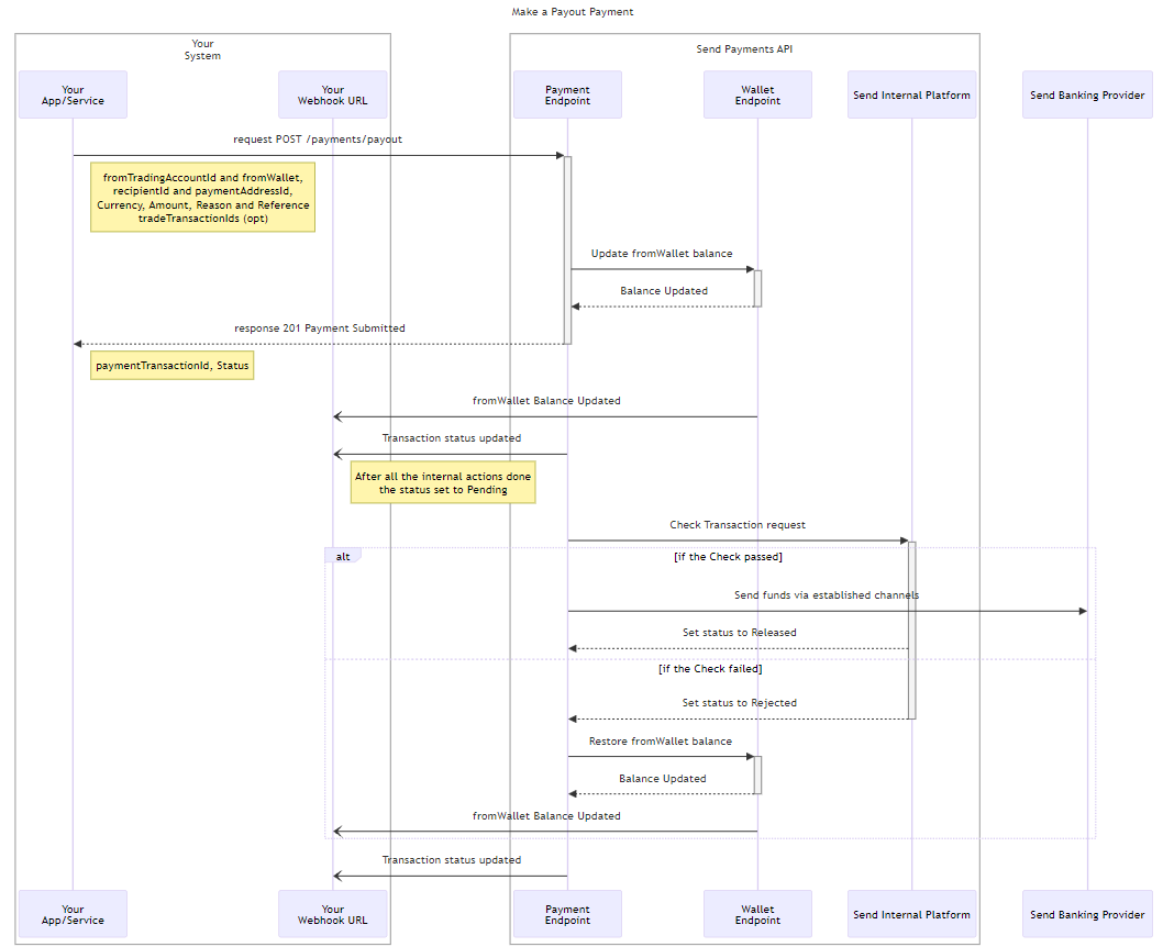 Payments are one of the main features of the platform. They can be used to send money to a Recipient and Payment Address outside the Send Ecosystem (further - Payouts), or to move money between Wallets within the Send Ecosystem (further - Transfers).