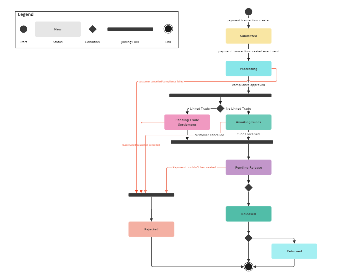 The Payout status flow differs slightly depending on if it is a single currency Payout via the POST /payments/payout or a Payout with a linked trade via POST /trade. If it's a single currency Payout it will be in Awaiting Funds until it has been funded. For a Payout with a linked trade, it will be in Pending Trade Settlement until the Trade hits the settlement day and has also been funded.