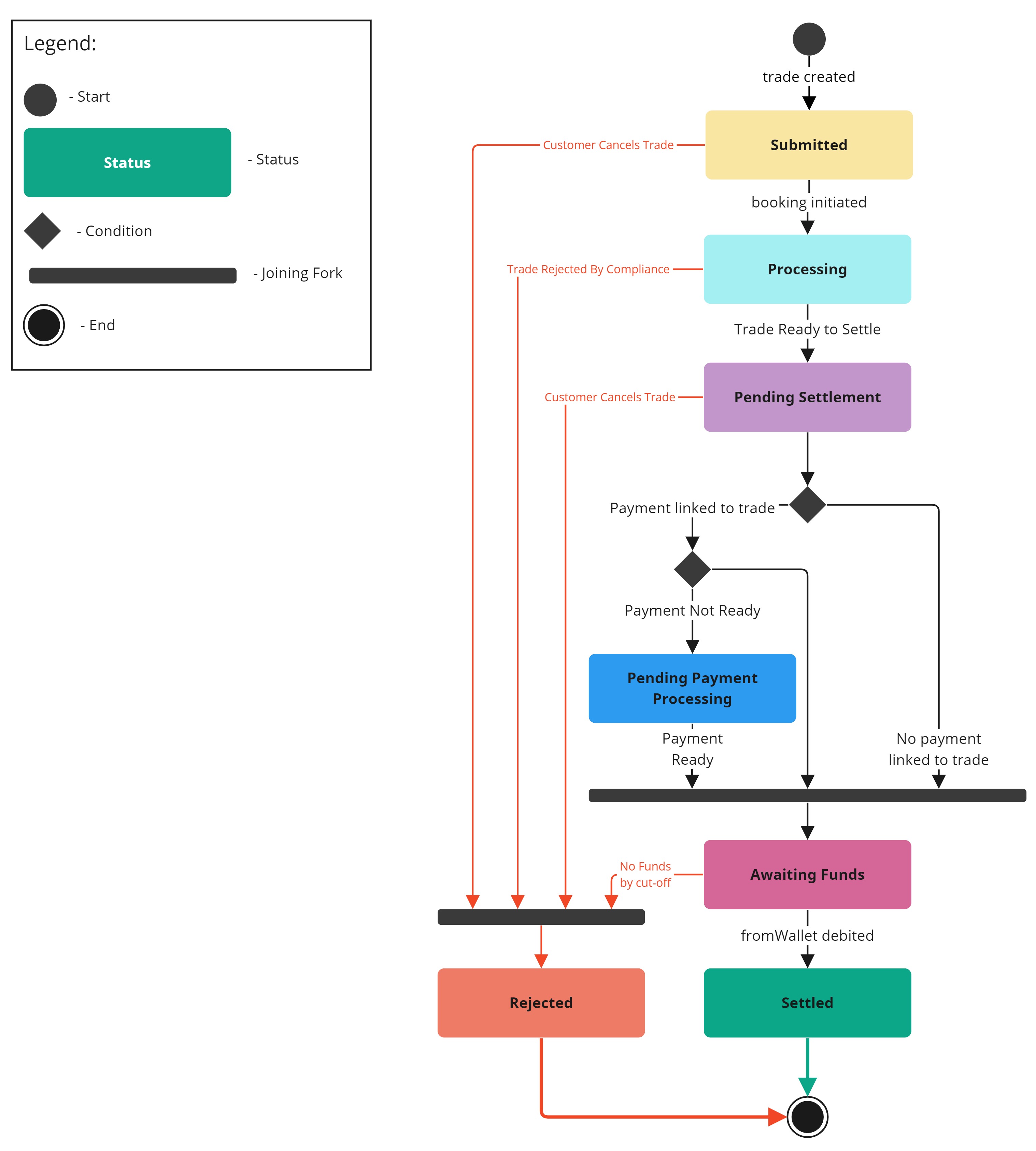 At this point, if compliance fails the Trade it will go into a Rejected status and Wallet debt will be erased along with the Payment if one was initiated by the Trade. Otherwise, once the trades settlement date has arrived, the Trade will go into the Awaiting Funds status. Note: This is true for the reverse as well, if a payment linked to a trade fails compliance checks, the trade will also be marked as Rejected.
