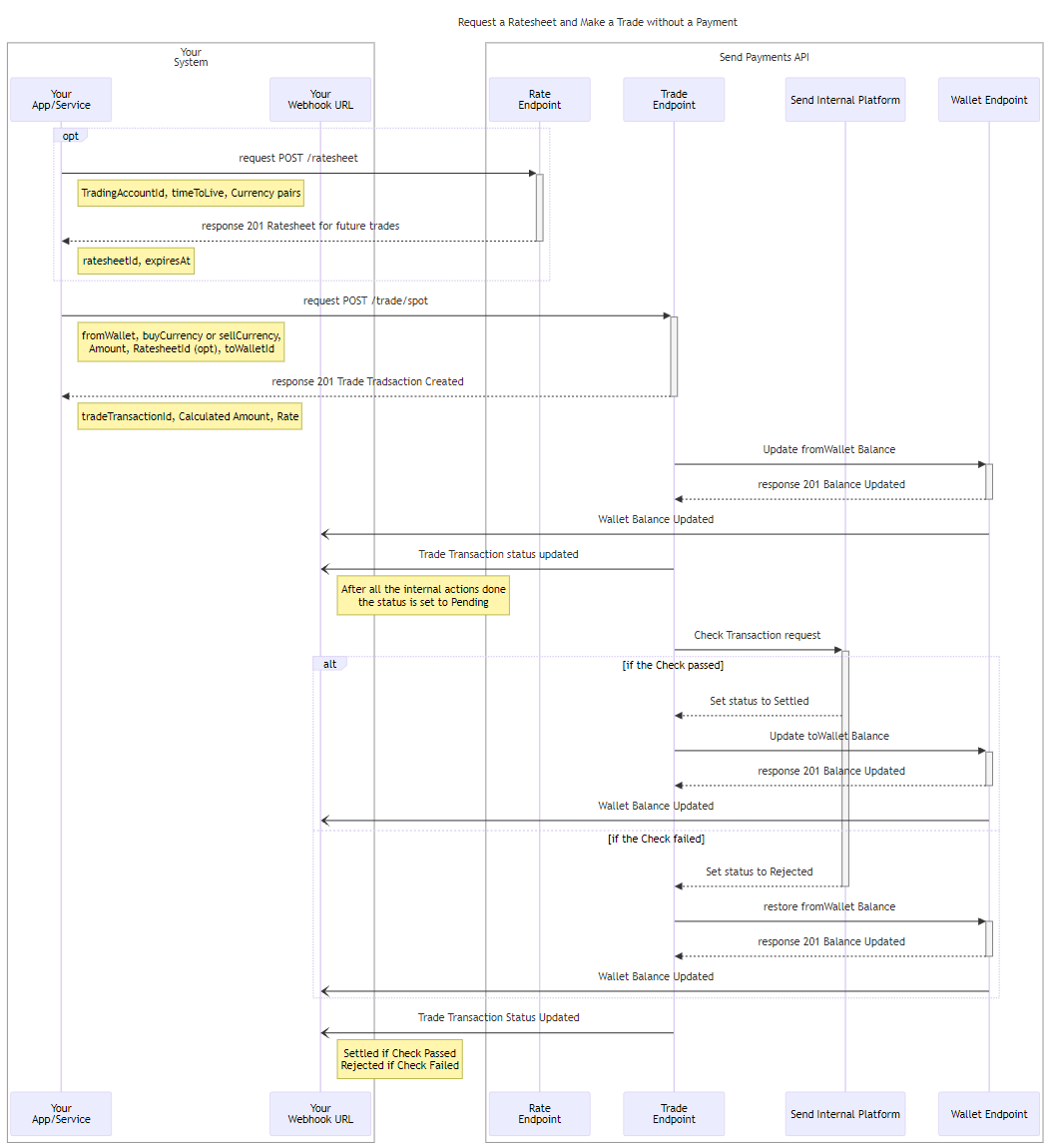 Before booking a Trade the user can request a Ratesheet. Requesting the Ratesheet will lock in a rate for the client for a short period of time. That will guarantee that the Trade will be performed with exactly that locked rate*. If Ratesheet is not included in Trade request, then Send will apply the best market rate available at the time of booking.