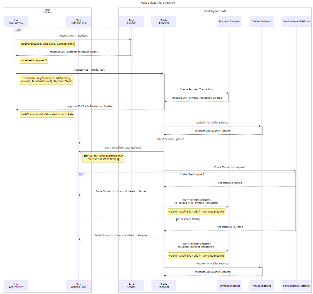 If there is a Payment object within the Trade request any necessary payments will also be initiated here and the paymentTransactionId passed back in the API for future reference.