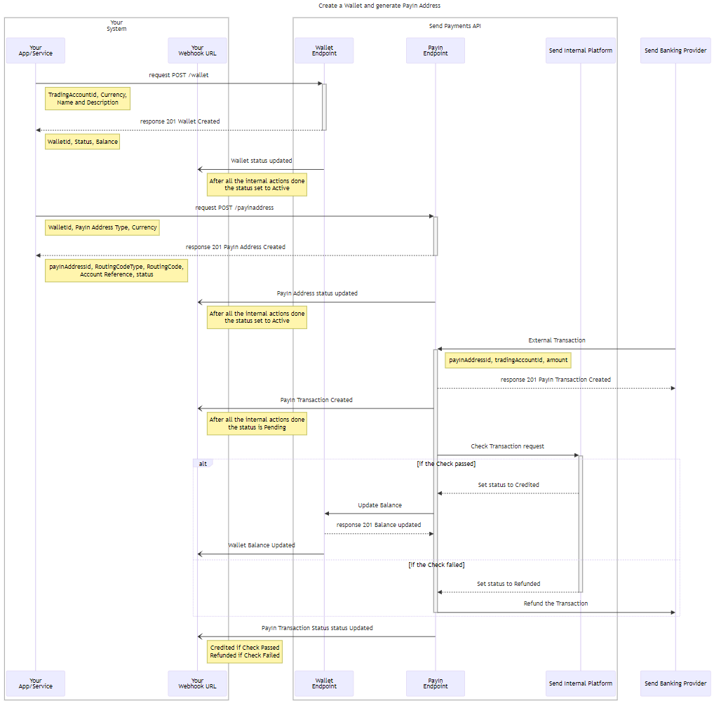To receive funds onto the platform you will need to create a PayIn Address for the Wallet. Each PayIn Address is unique to that Wallet. Each Transaction you make to a particular PayIn Address will be stored within the associated Wallet and can be referenced in GET requests.